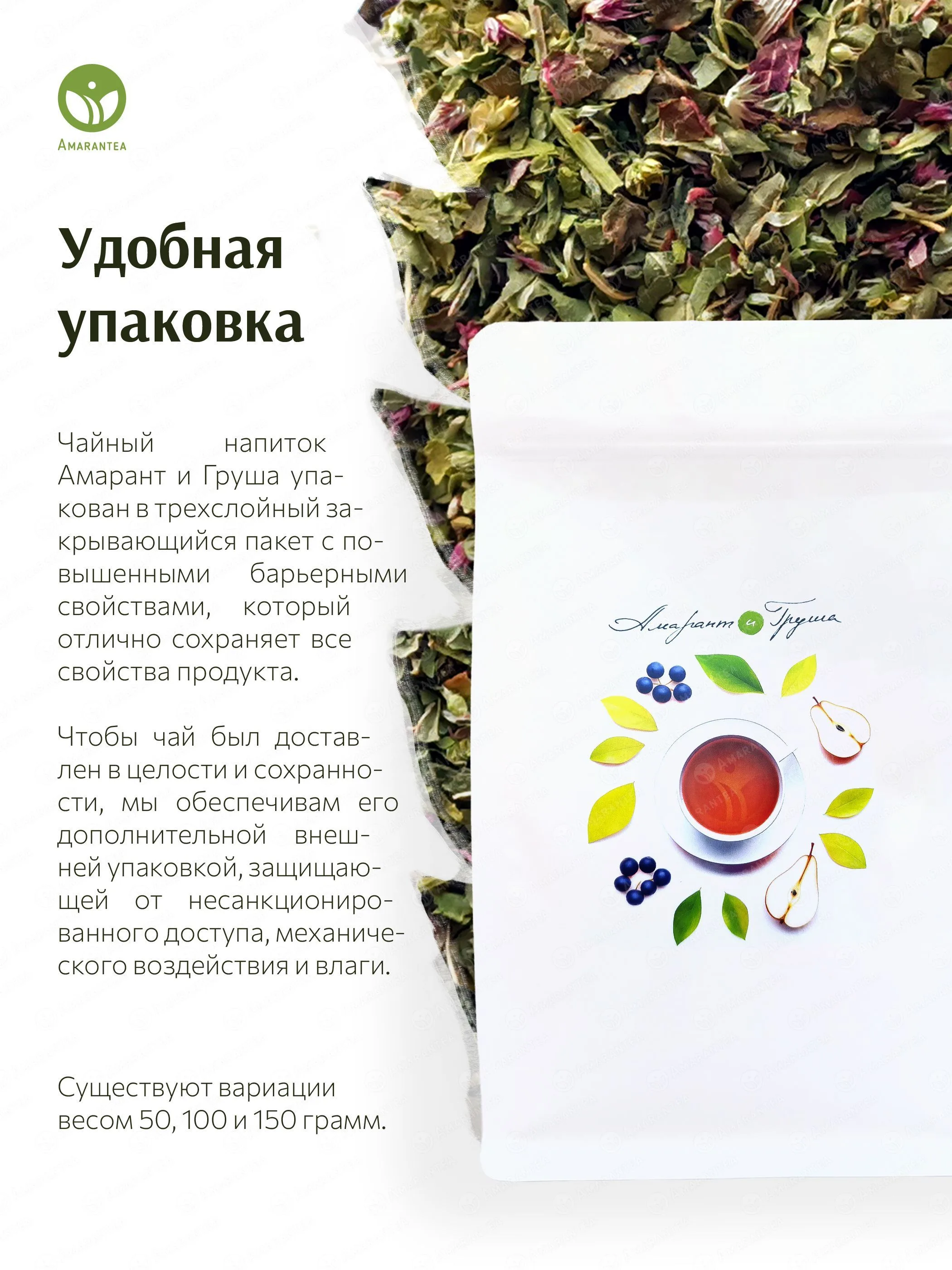 «Амарант и Груша» — натуральный чайный напиток из зеленого амаранта, сушёной груши и барбариса. Богат растительным белком, антиоксидантами и витаминами C и A, поддерживающими иммунитет и здоровье кожи.