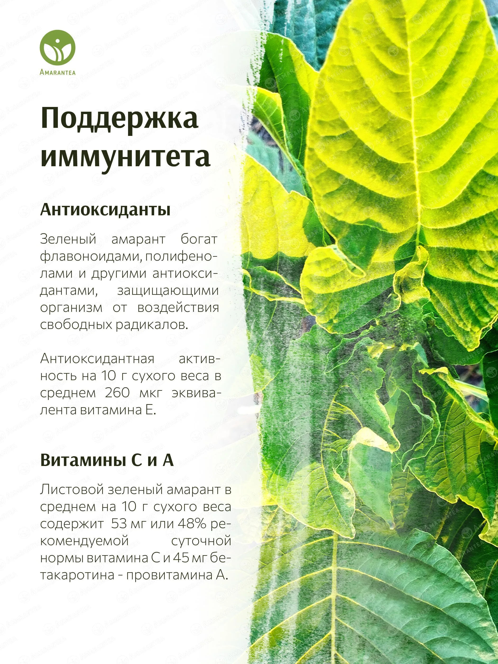 Полноценный растительный белок: зеленый амарант богат белком, который содержит все незаменимые аминокислоты, что делает его редким источником белка среди растительных продуктов. Регулярное употребление помогает снизить чувство голода и создает ощущение сытости.