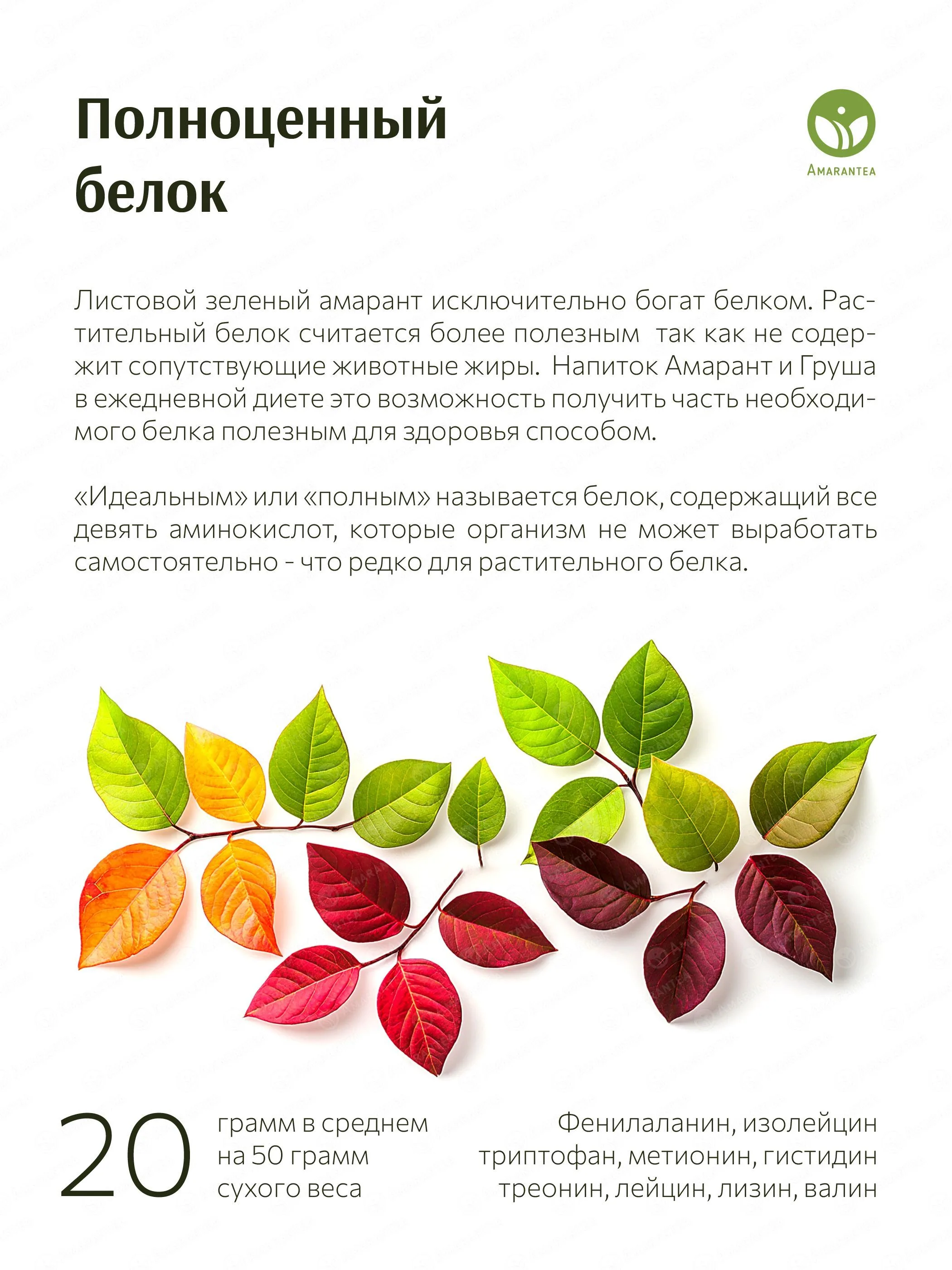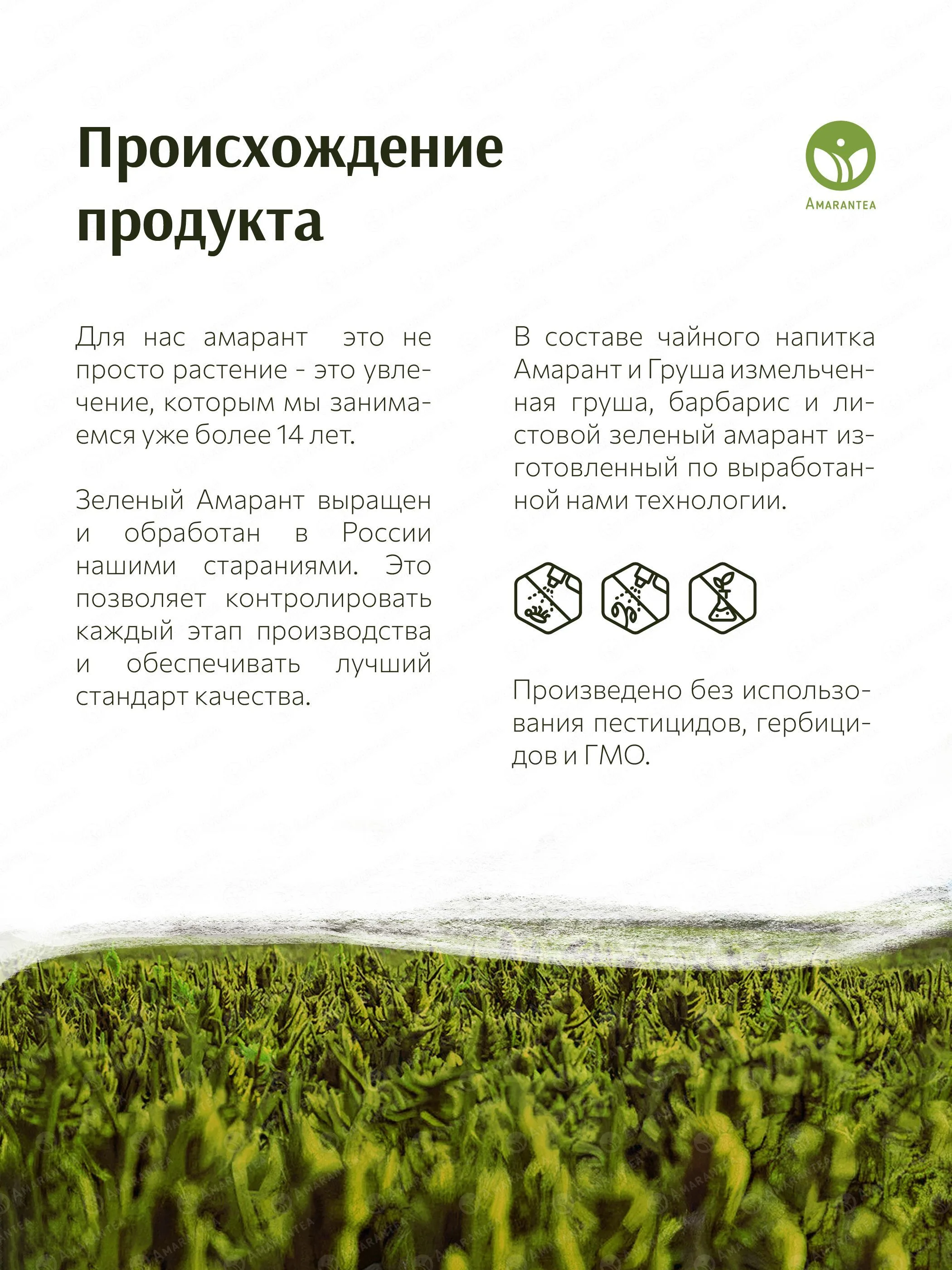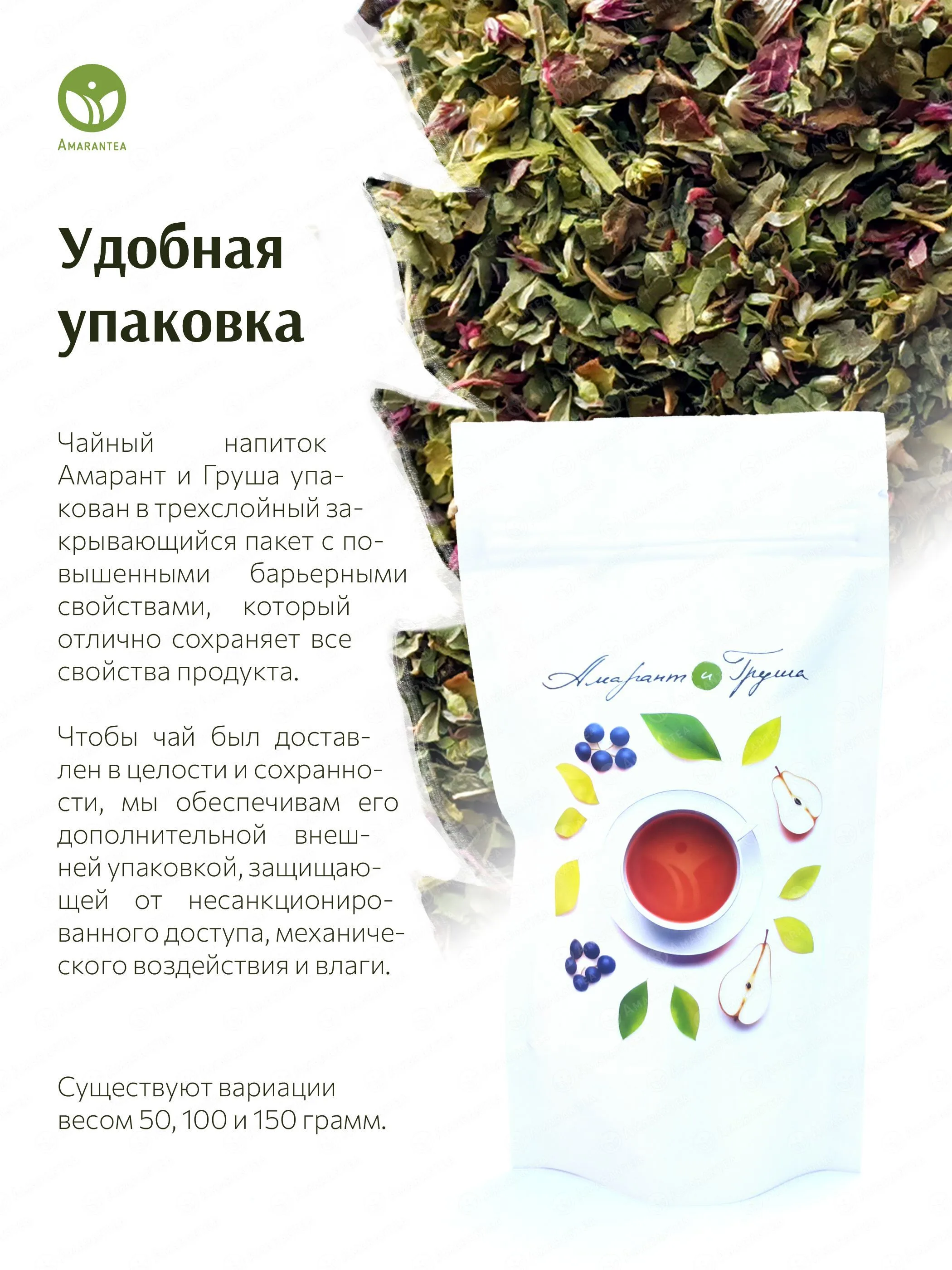 «Амарант и Груша» — натуральный чайный напиток, в котором зеленый амарант сочетается с сушёной грушей и барбарисом. Он обладает сбалансированным вкусом, богат растительным белком, антиоксидантами, витаминами.