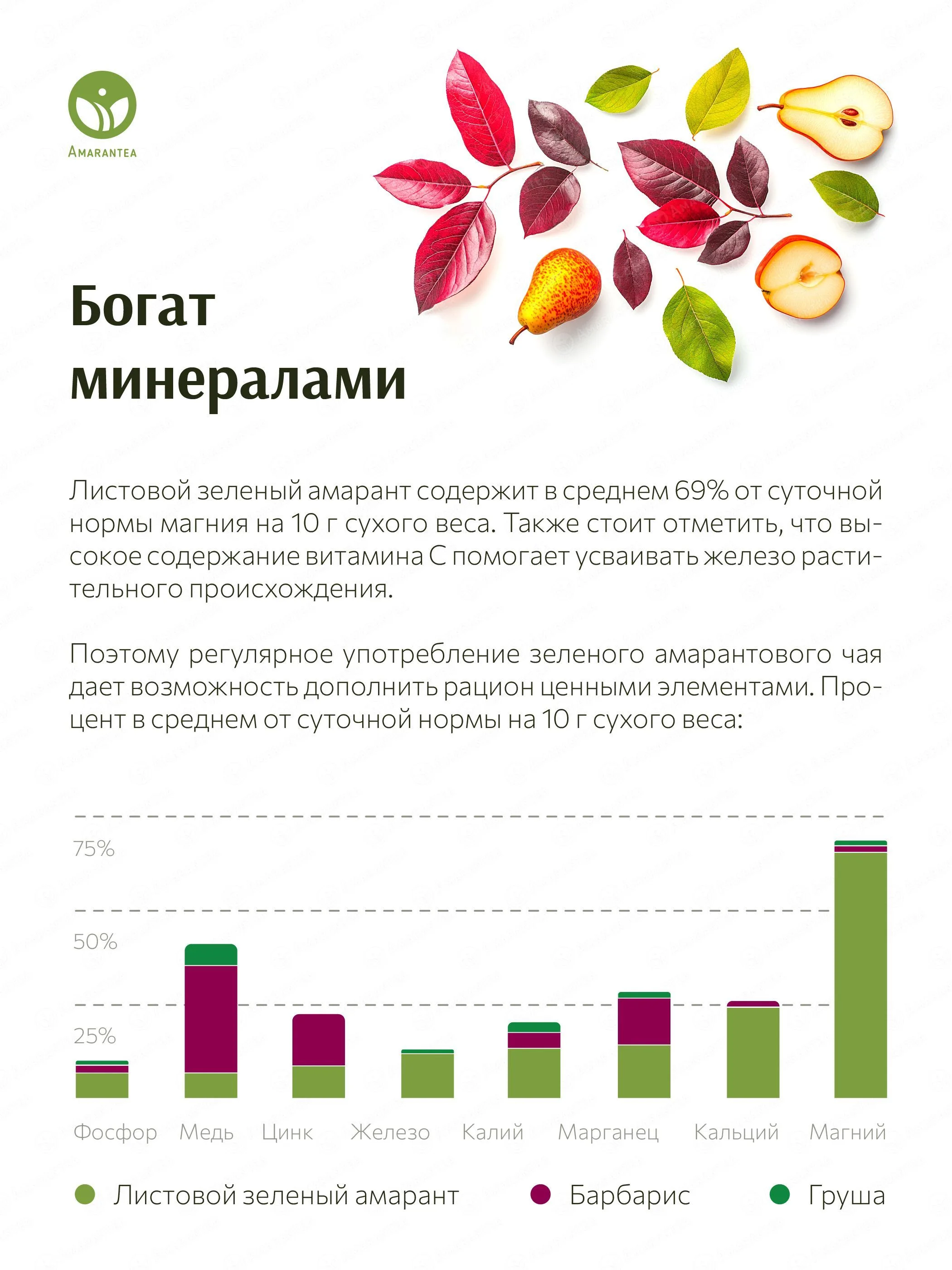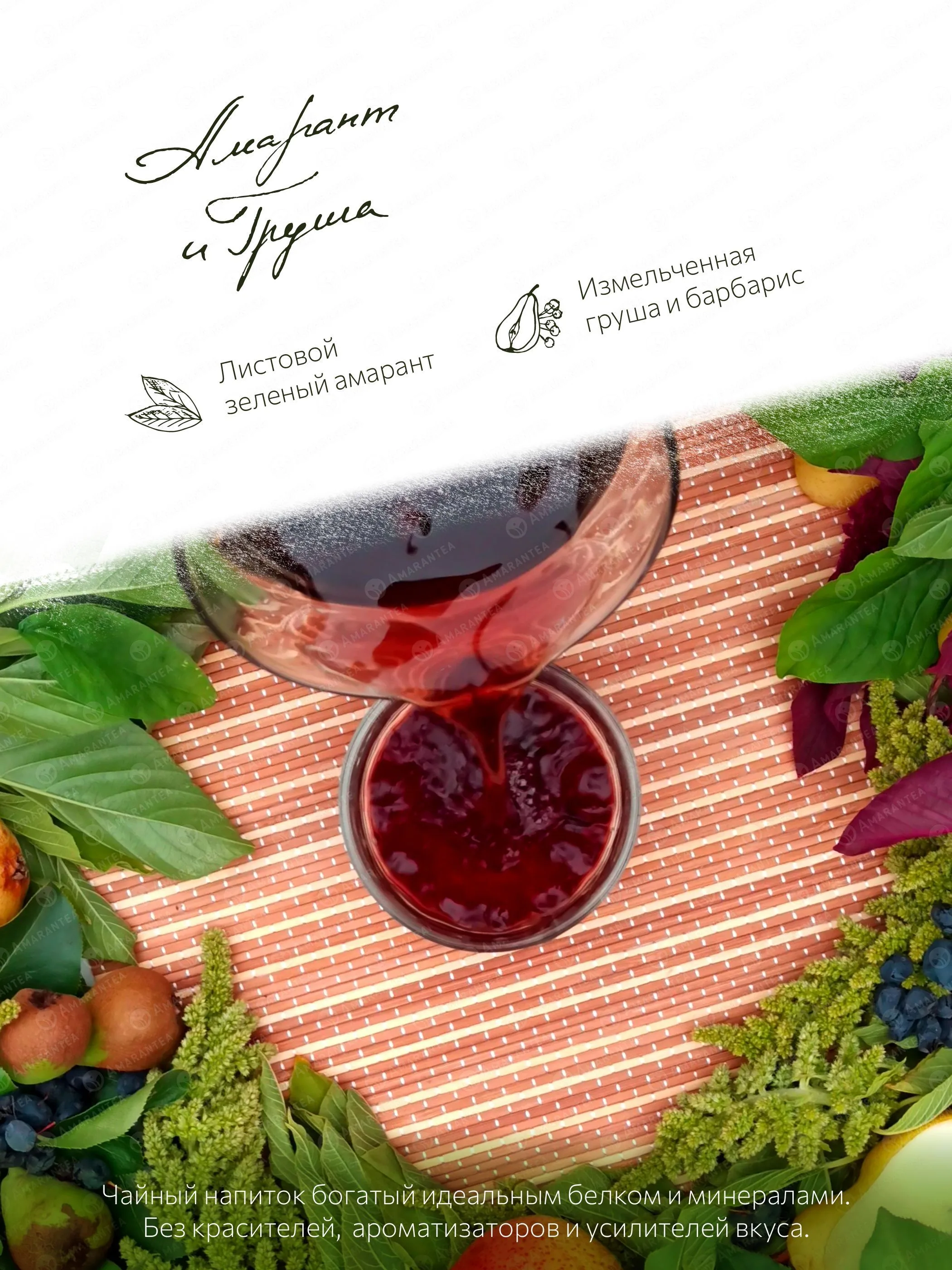 «Амарант и Груша» — это сочетание зеленого амаранта, сушеной груши и барбариса, которые придают напитку свежий и сбалансированный вкус.