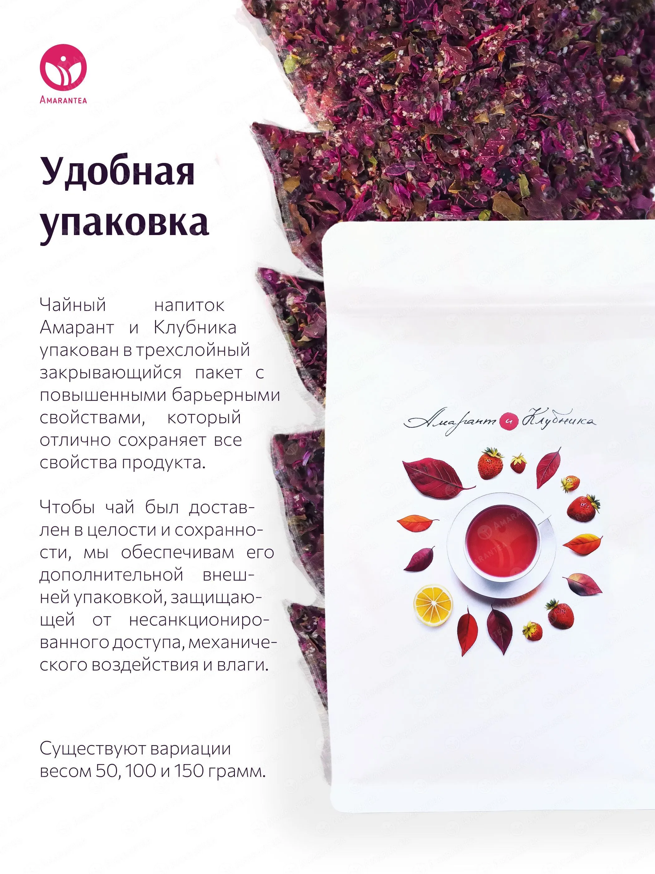 «Амарант и Клубника» — натуральный чайный напиток, где листовой красный амарант гармонично сочетается с сушёной клубникой и лимоном. Напиток не содержит искусственных добавок, ароматизаторов, красителей и консервантов. Его сбалансированный вкус с ягодными и цитрусовыми нотками дополняется богатым содержанием растительного белка, антиоксидантов и витаминов.