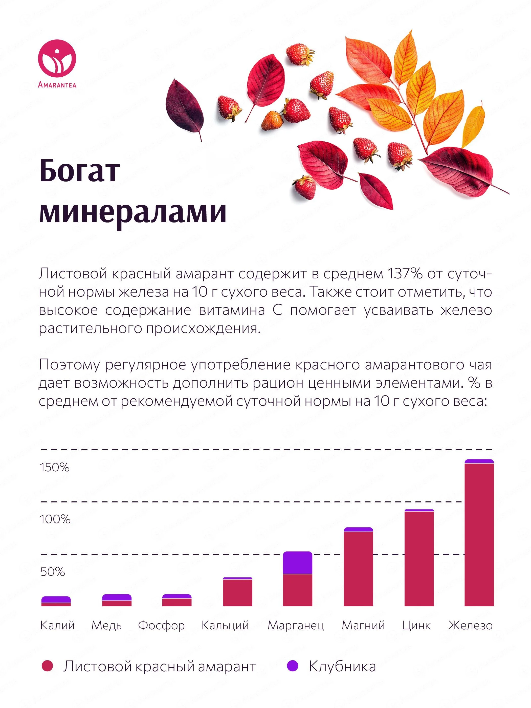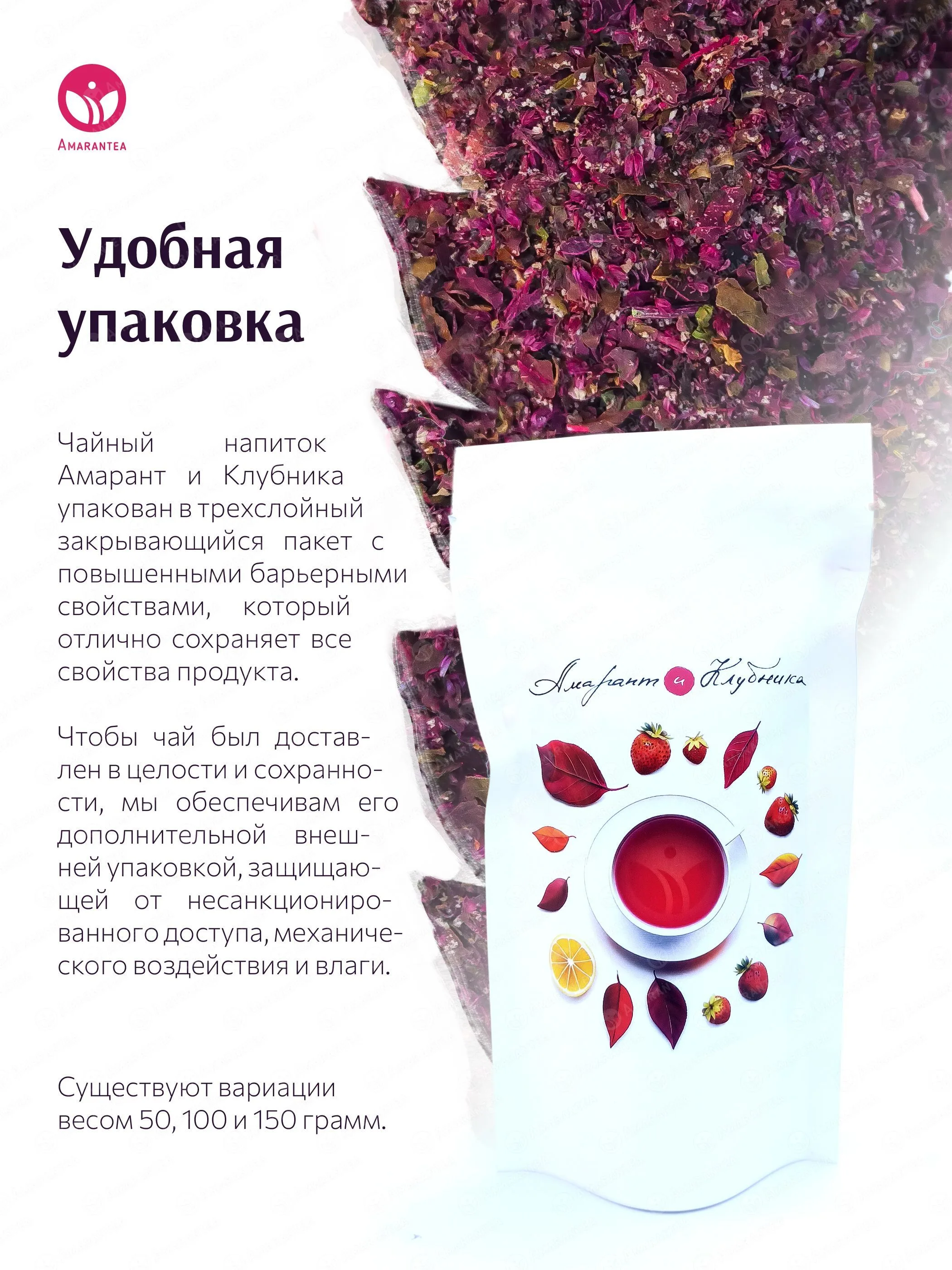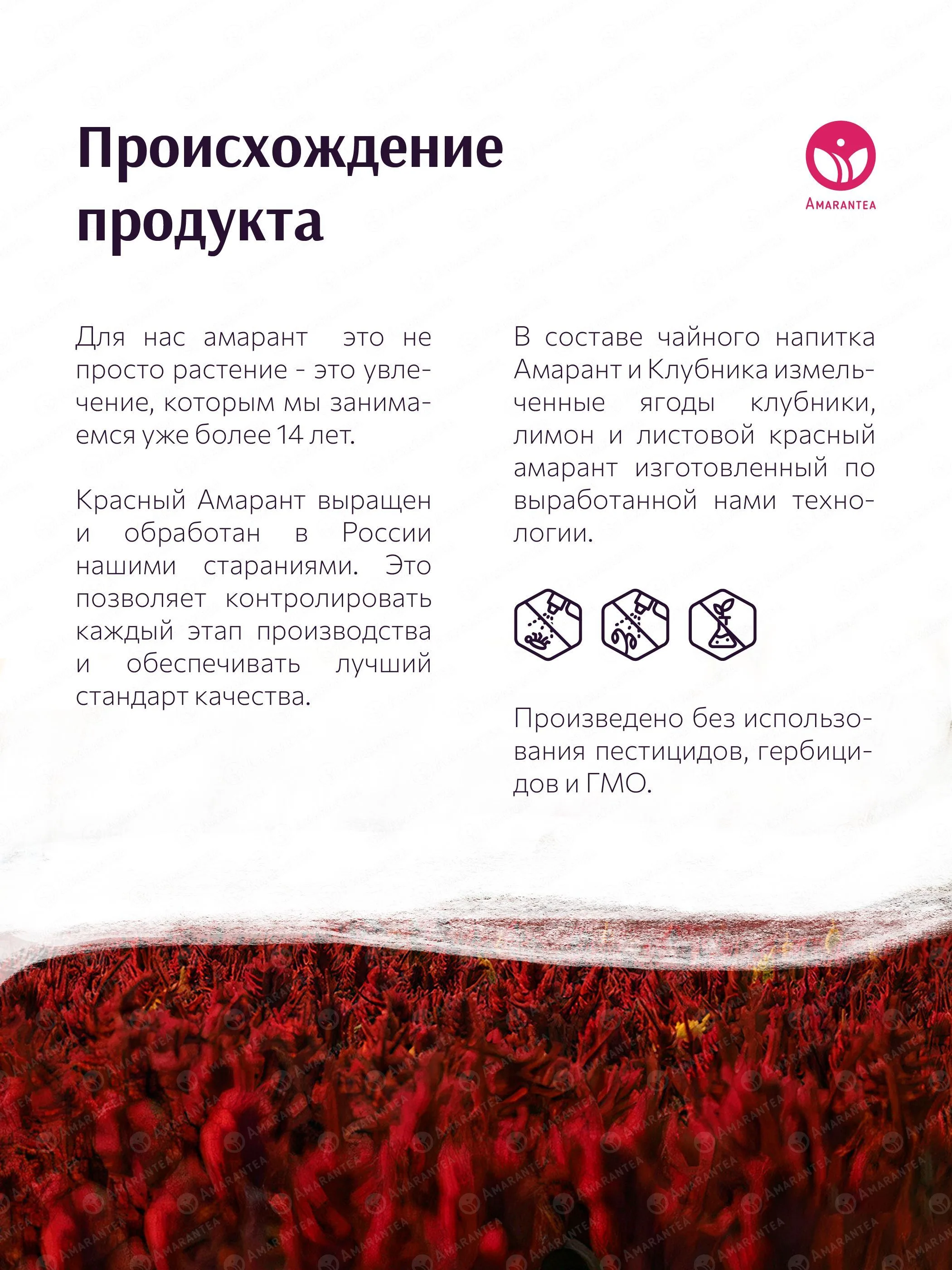 «Амарант и Клубника» — натуральный чайный напиток, где листовой красный амарант гармонично сочетается с сушёной клубникой и лимоном. Напиток не содержит искусственных добавок, ароматизаторов, красителей и консервантов. Его сбалансированный вкус с ягодными и цитрусовыми нотками дополняется богатым содержанием растительного белка, антиоксидантов и витаминов.