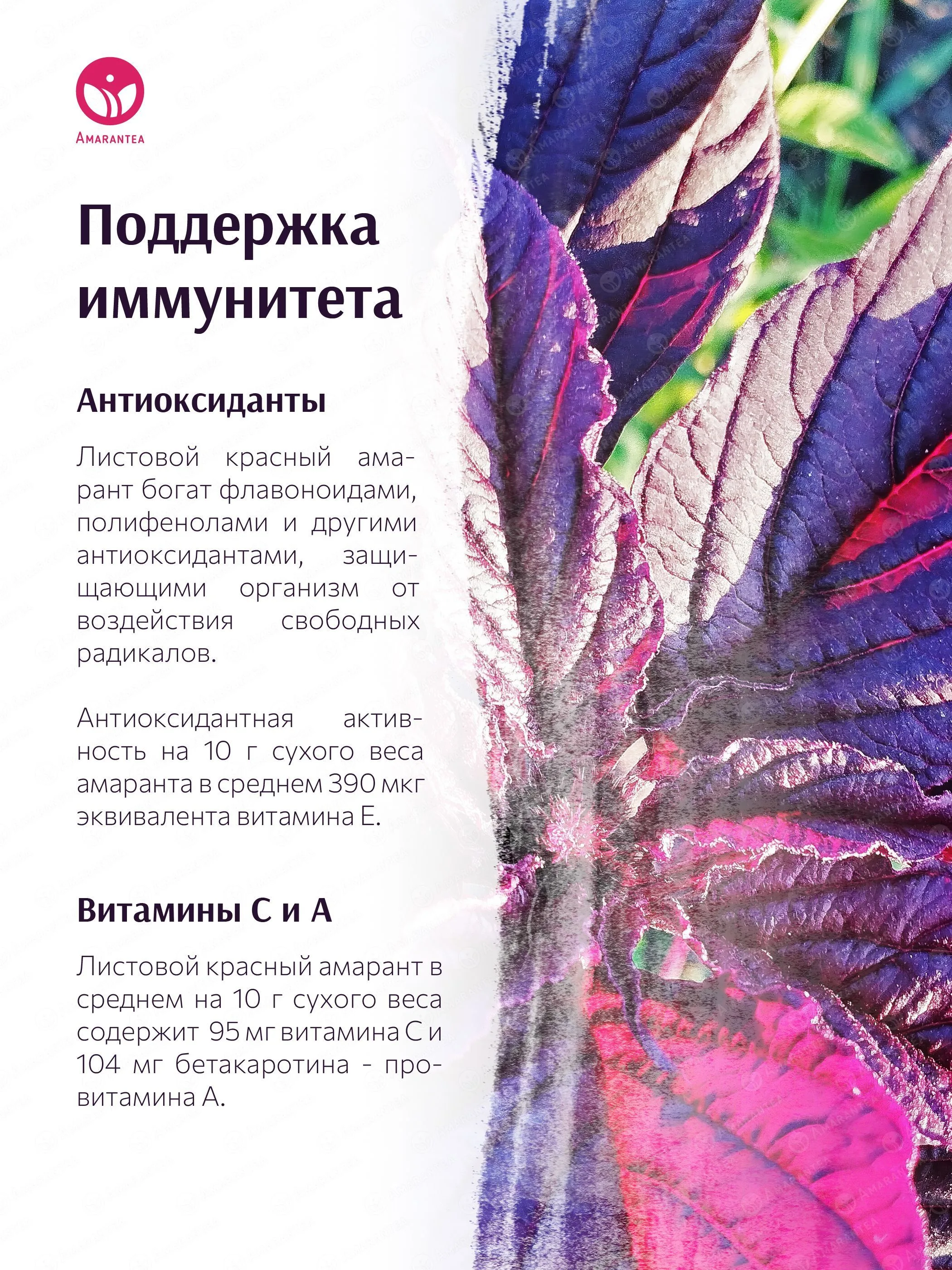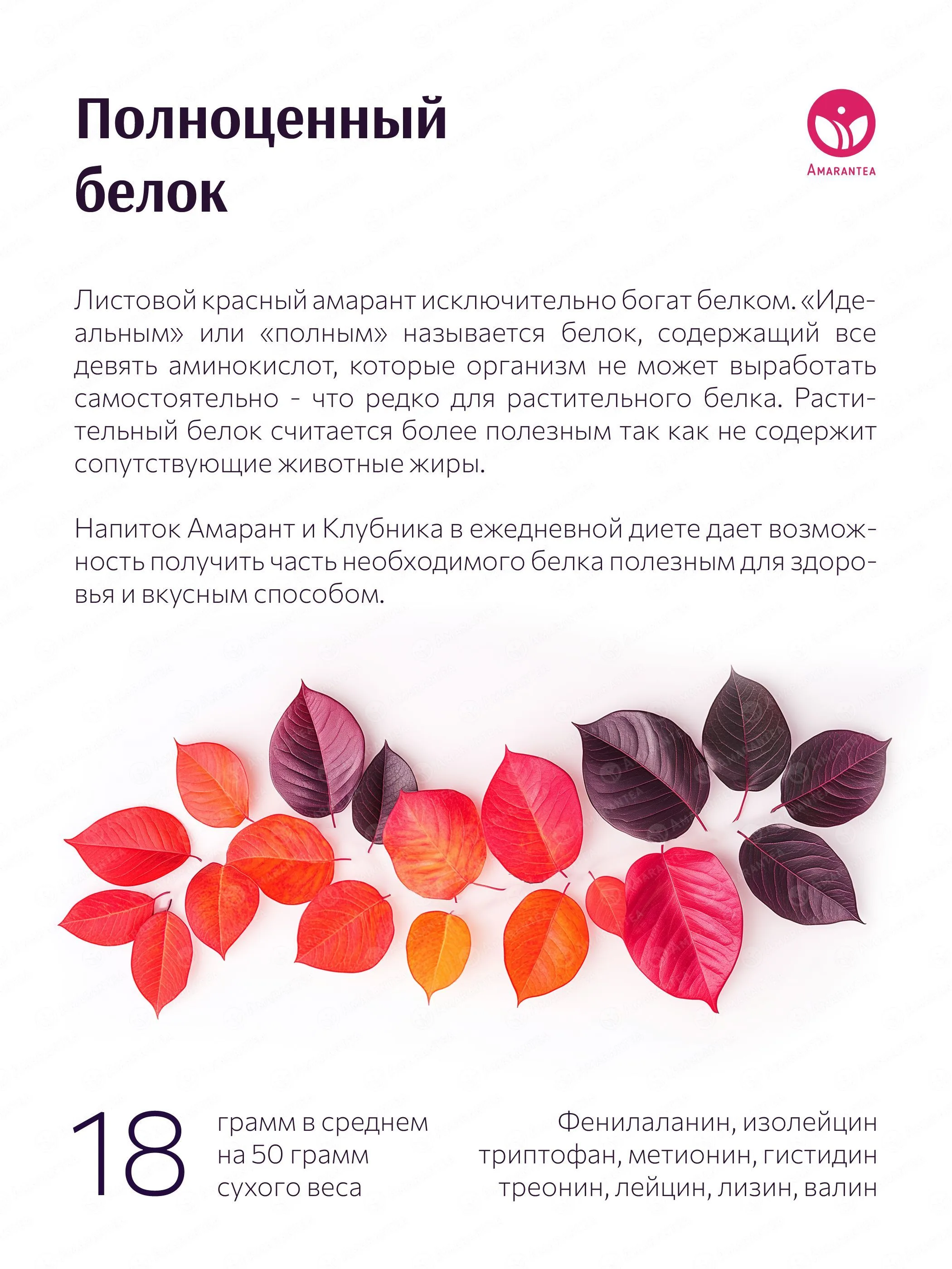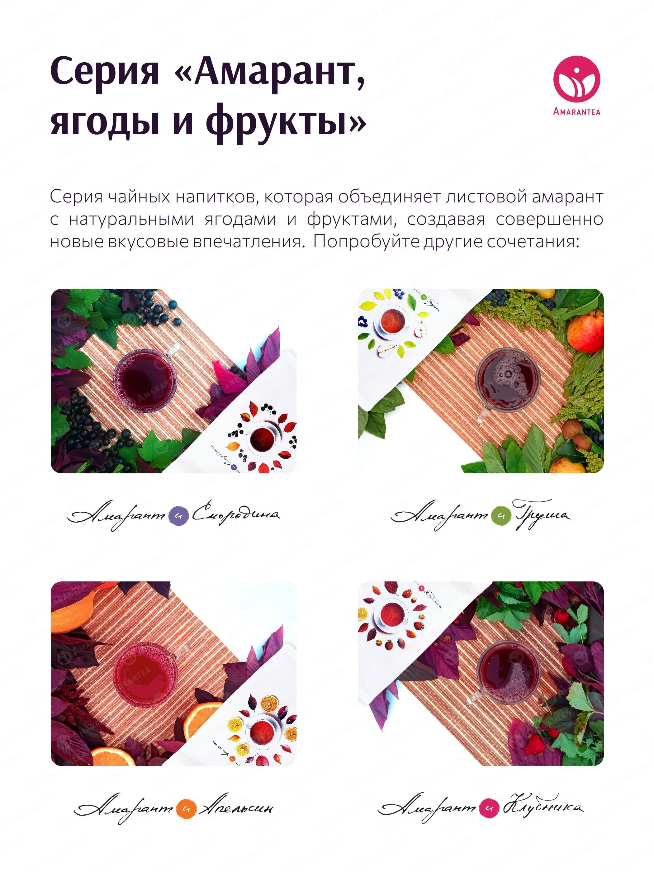 «Амарант и Клубника» — натуральный чайный напиток, где листовой красный амарант гармонично сочетается с сушёной клубникой и лимоном. Напиток не содержит искусственных добавок, ароматизаторов, красителей и консервантов. Его сбалансированный вкус с ягодными и цитрусовыми нотками дополняется богатым содержанием растительного белка, антиоксидантов и витаминов.