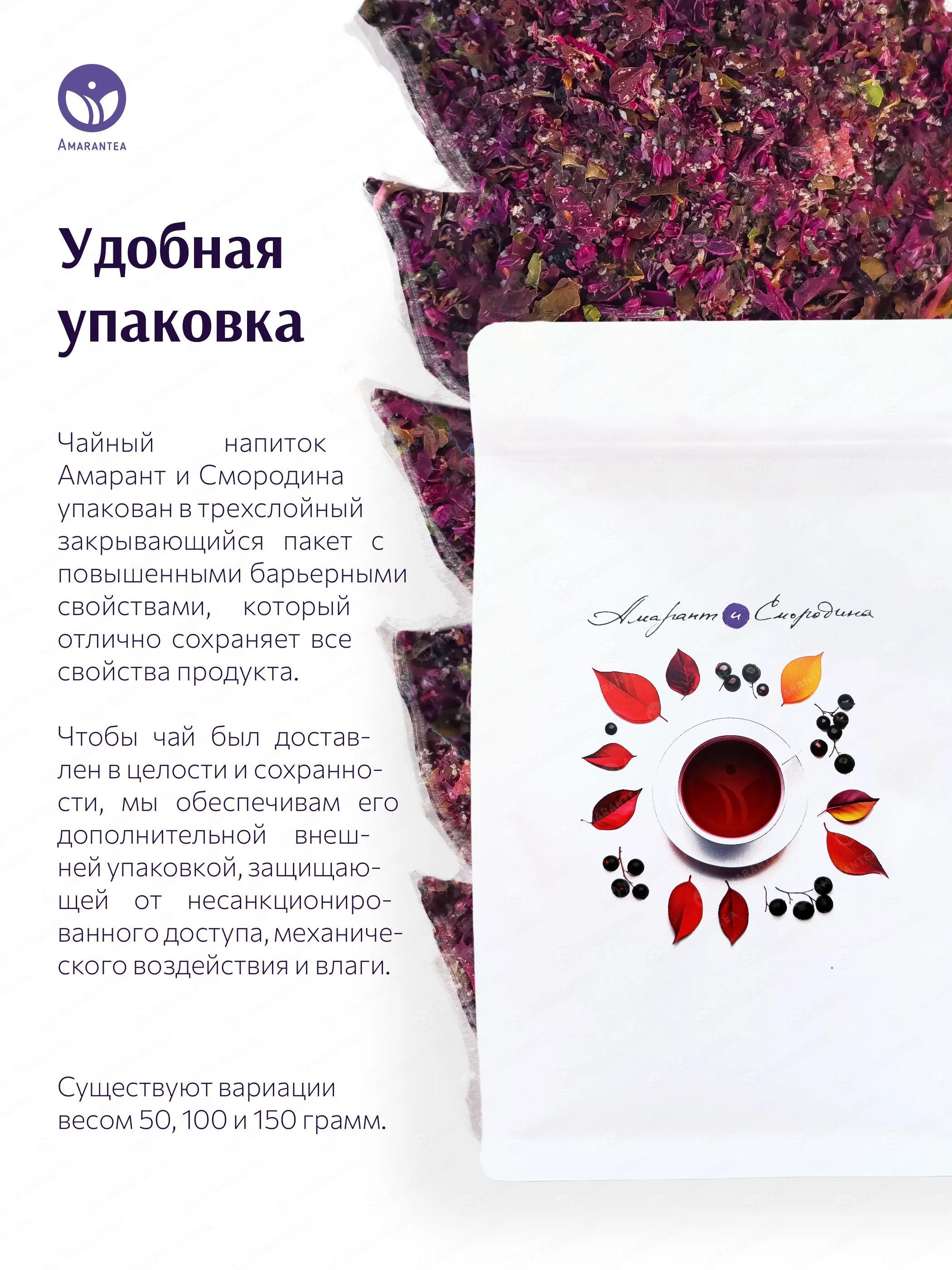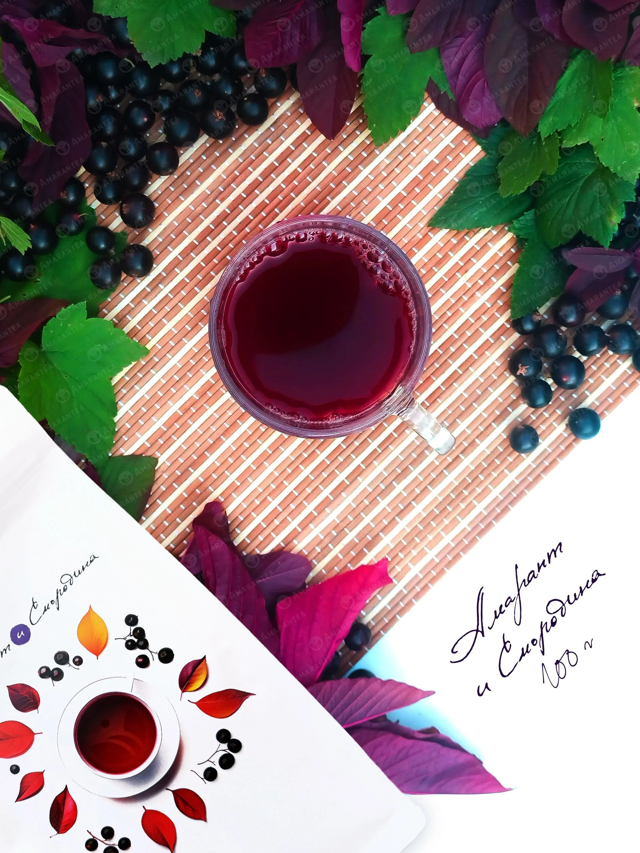 «Амарант и Смородина» — натуральный чайный напиток из красного амаранта и черной смородины. Продукт не содержит искусственных добавок, красителей, ароматизаторов. Напиток обладает насыщенным вкусом и полезными свойствами, включая полноценный растительный белок, антиоксиданты и витамины.
