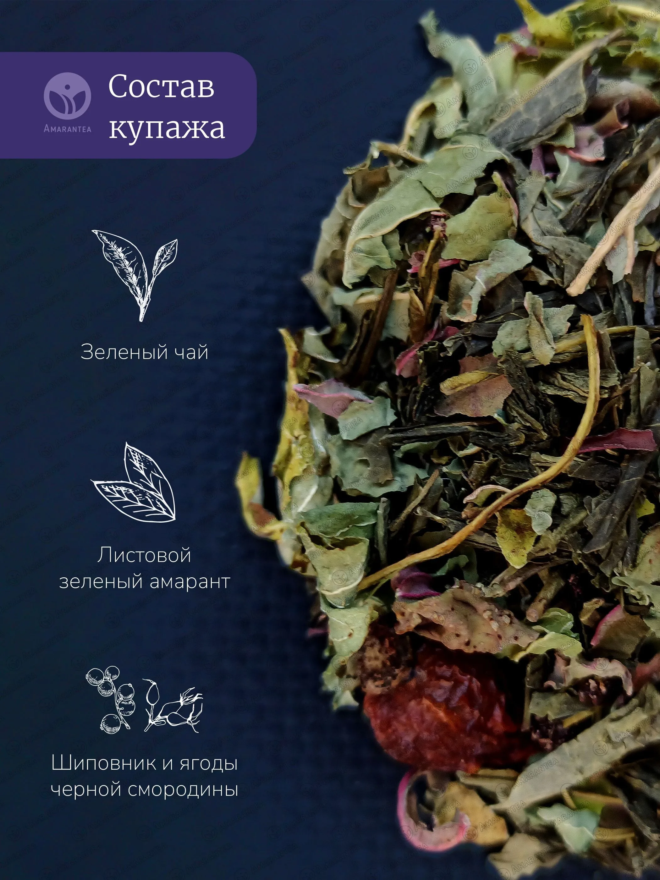 | Состав | Чай зеленый листовой, амарант зеленый, шиповник, ягоды черной смородины |