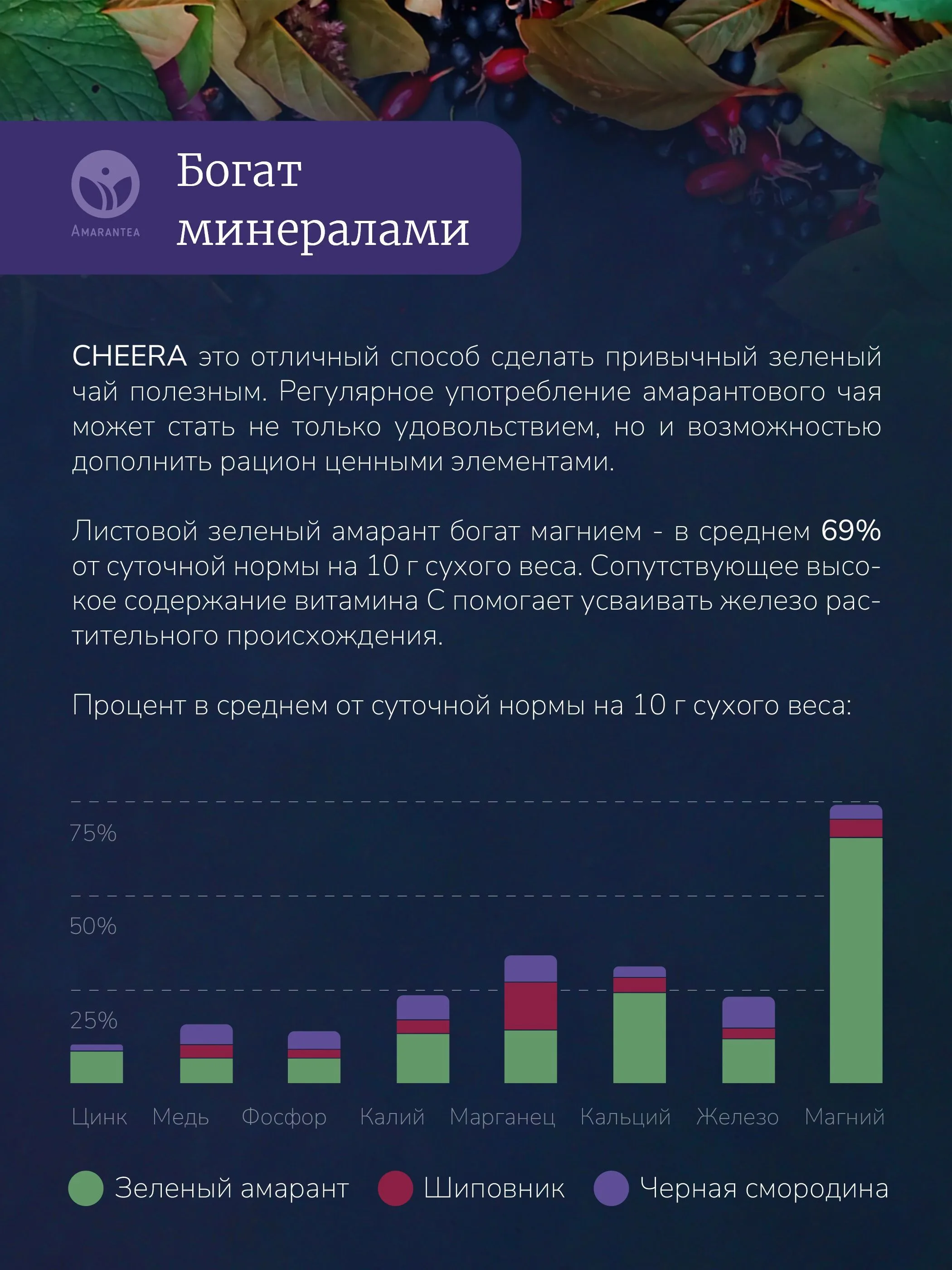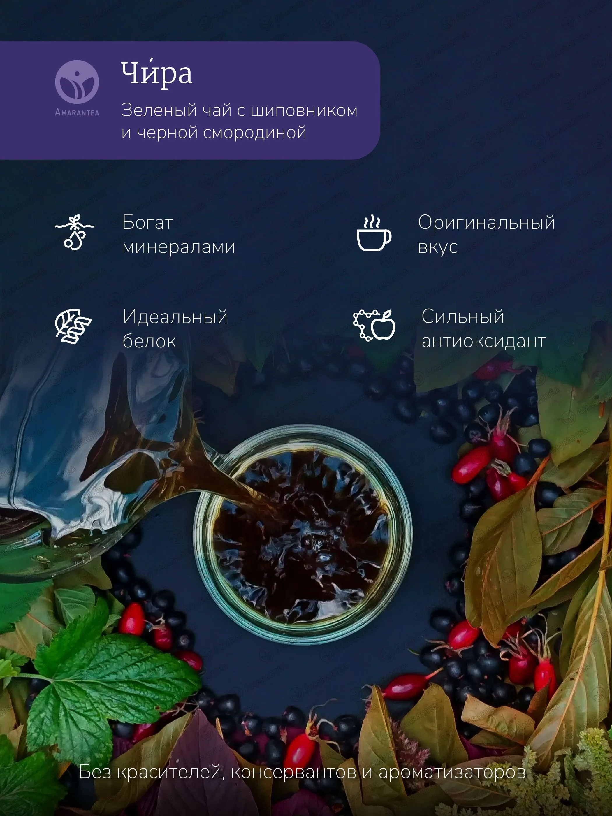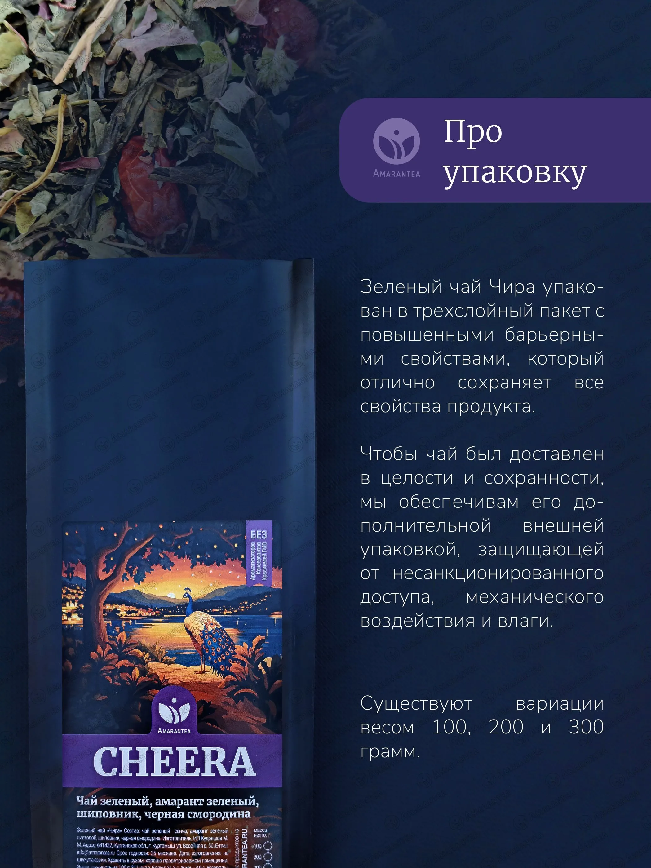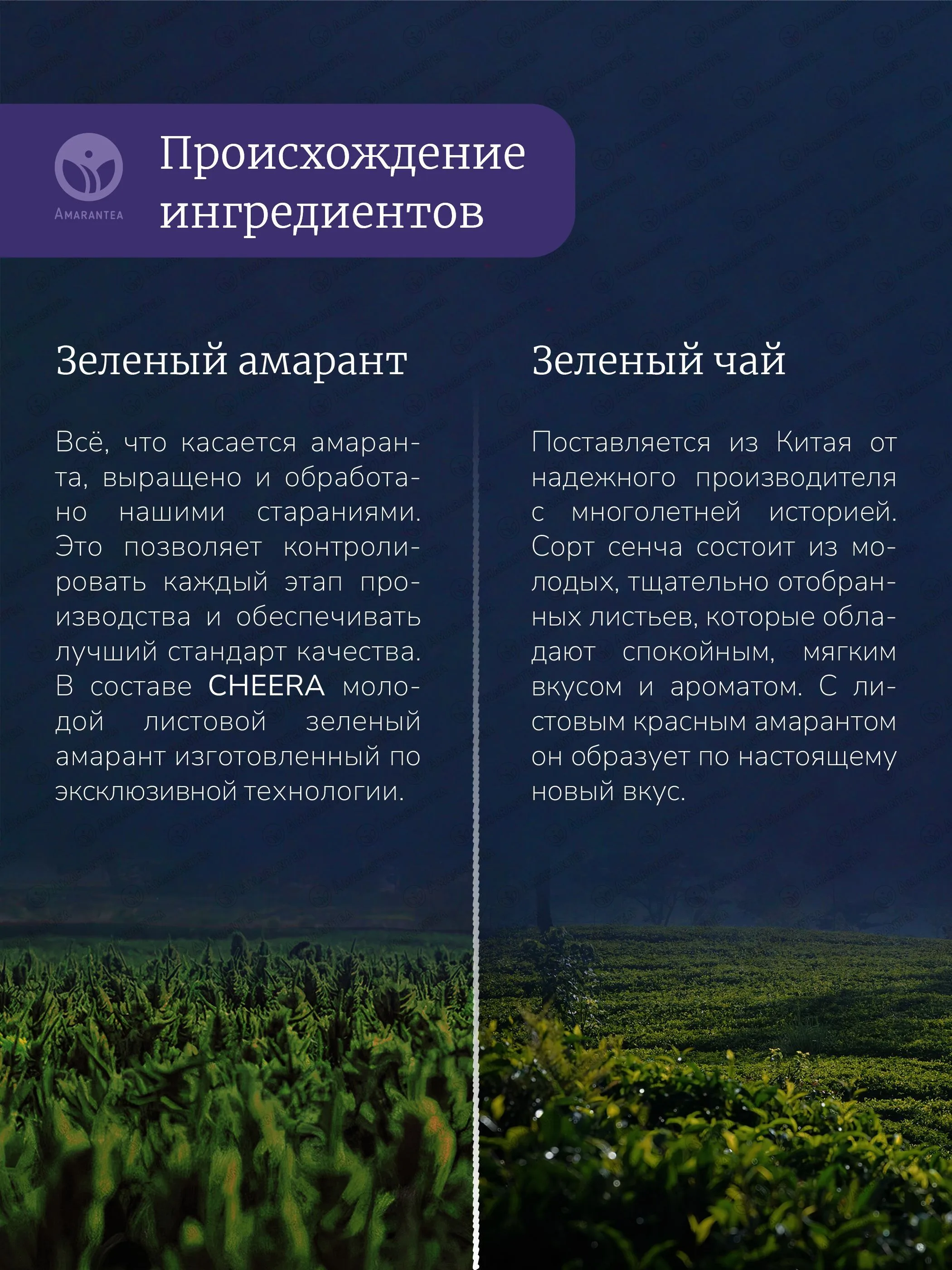 CHEERA от Amarantea — это зеленый чай с зеленым амарантом, шиповником и черной смородиной.